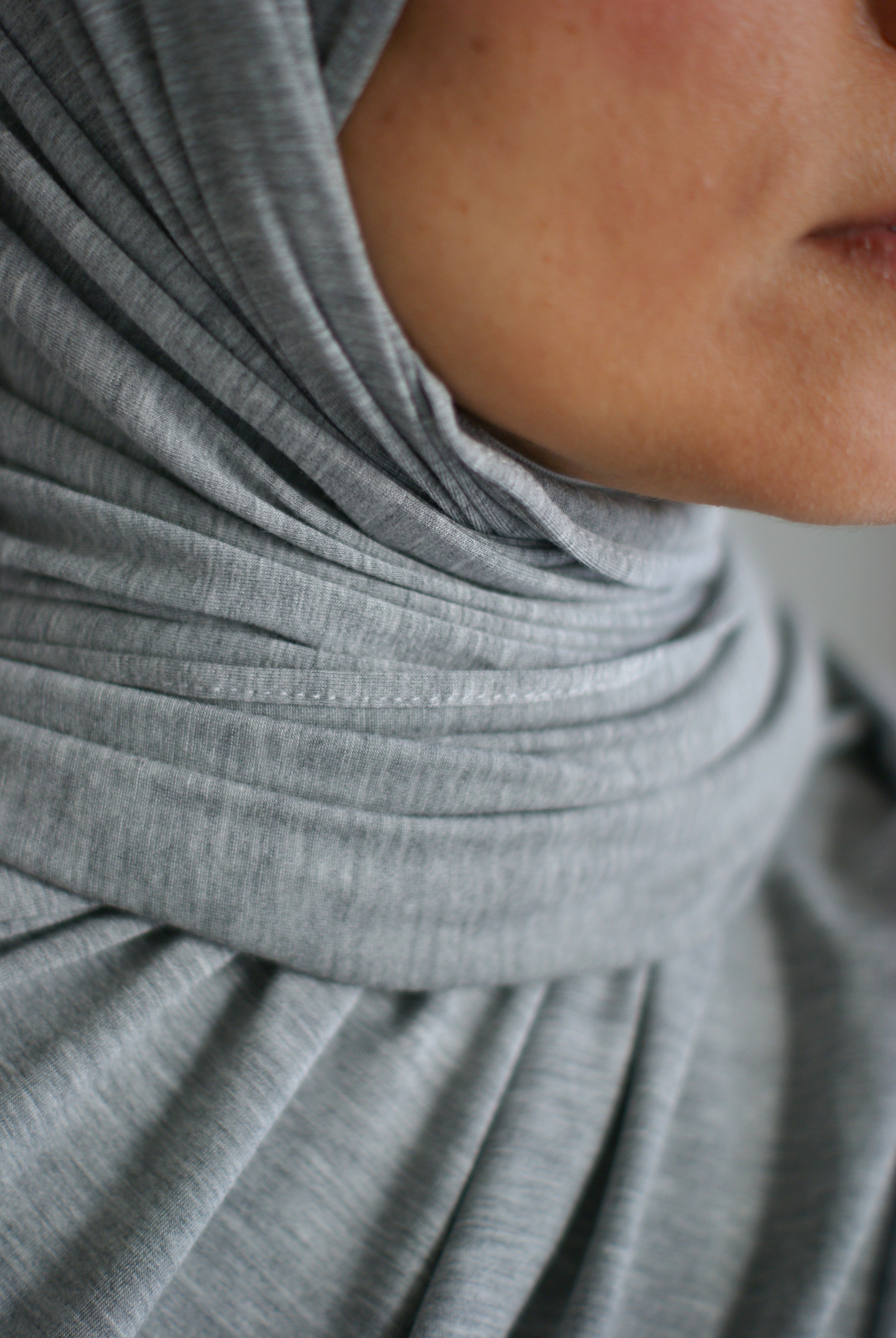 Ne nécessite pas d'attaches : s’enroule facilement et reste bien en place toute la journée grâce à son tissu extensible, on peut le coincer sous le menton sans nécessairement mettre d'épingle. Mais si on désire en porter, le tissu en est très résistant.