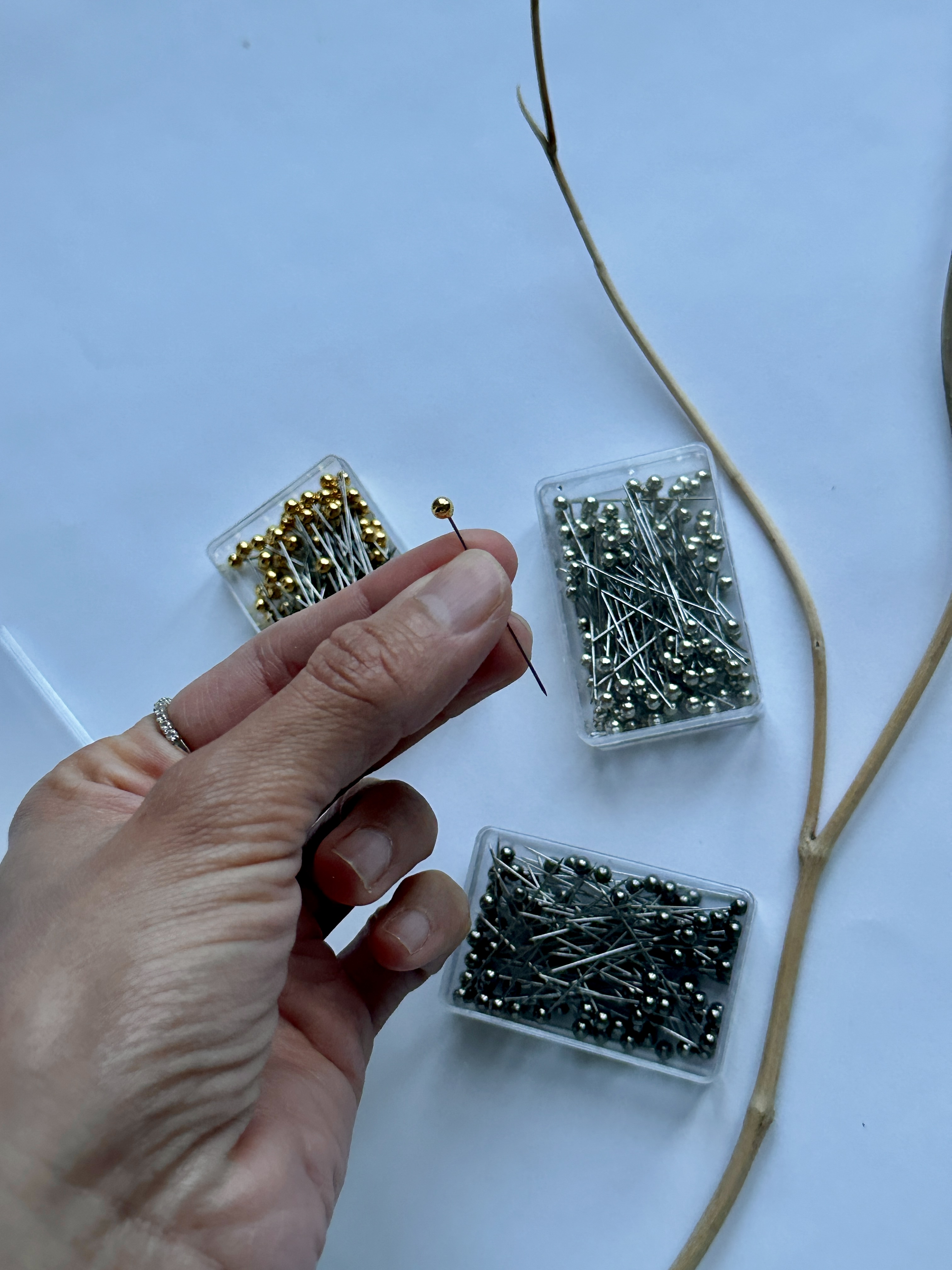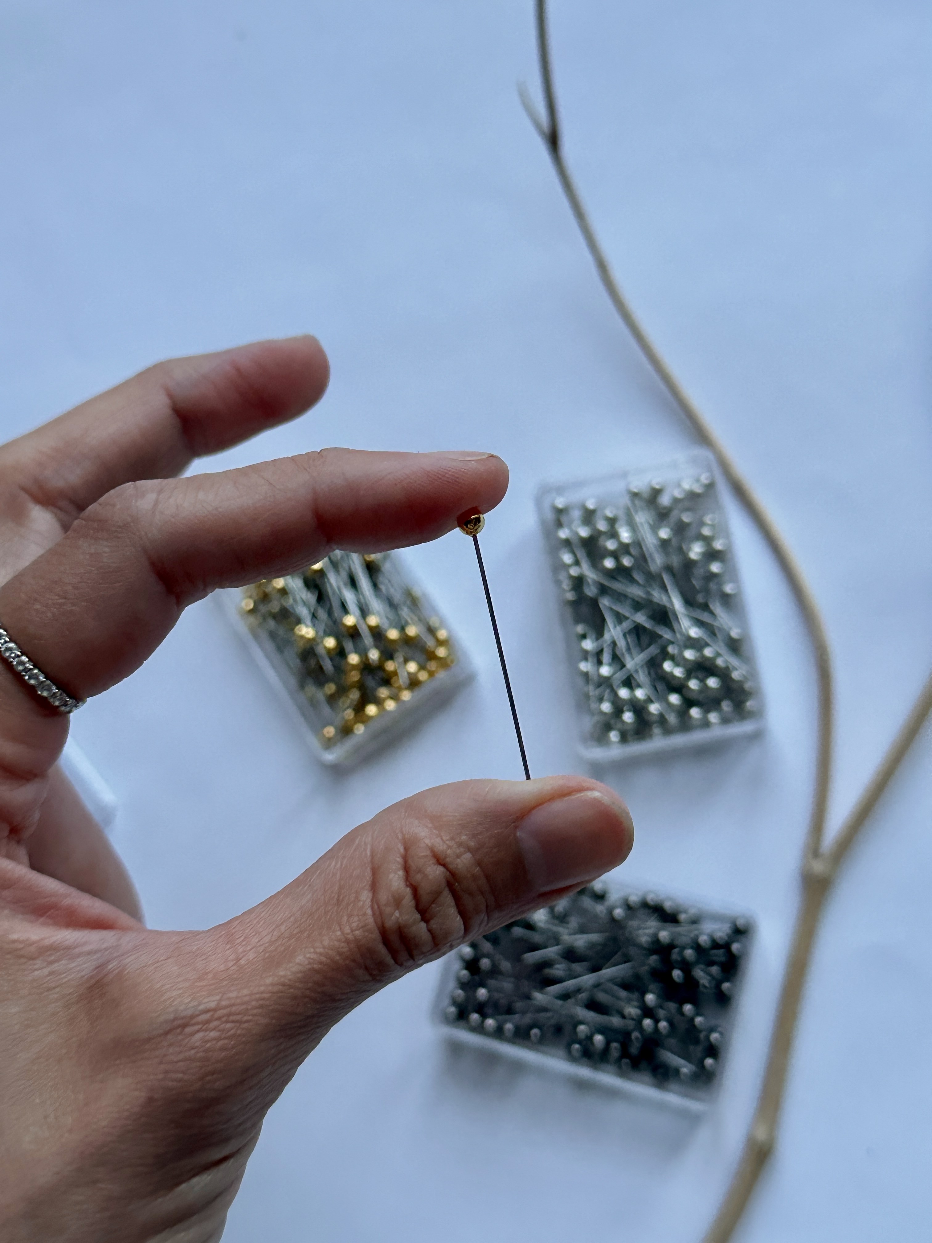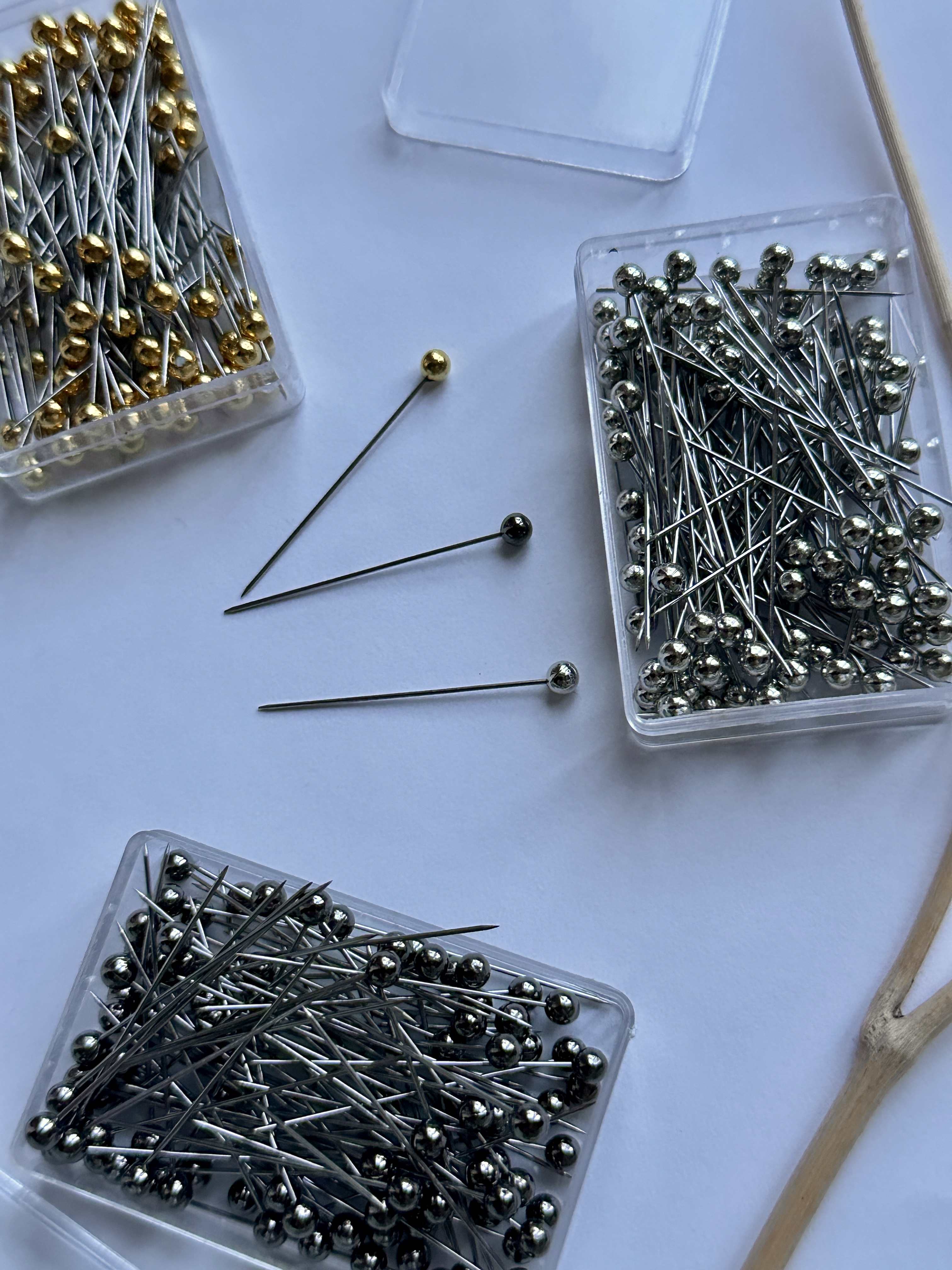 Environ 100 aiguilles par boites: Une boite embouts dorés Une boite embouts argentés Une boite embouts noirs argentés Ces aiguilles sont idéales pour fixer votre voile a un vêtement. Elles...